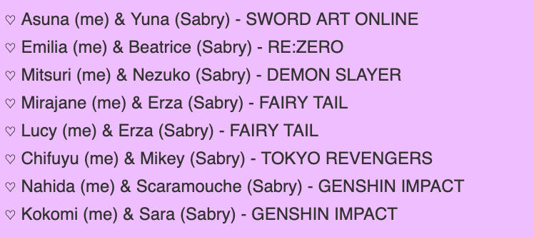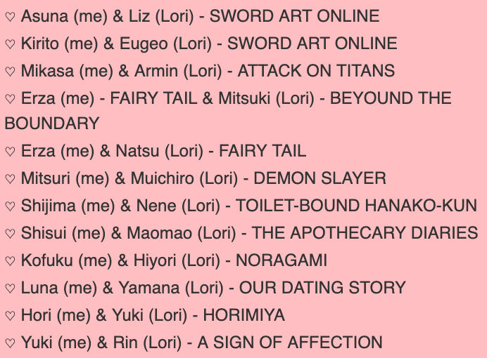 | editing, playing comfy games, writing, reading, nightwatching with family, sword art online & lucifer. |